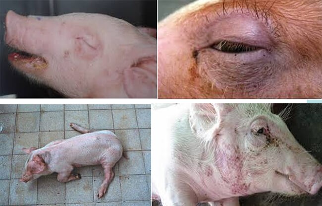 - Heo xuất hiện các triệu chứng như phù vùng đầu, mí mắt, hầu họng.
